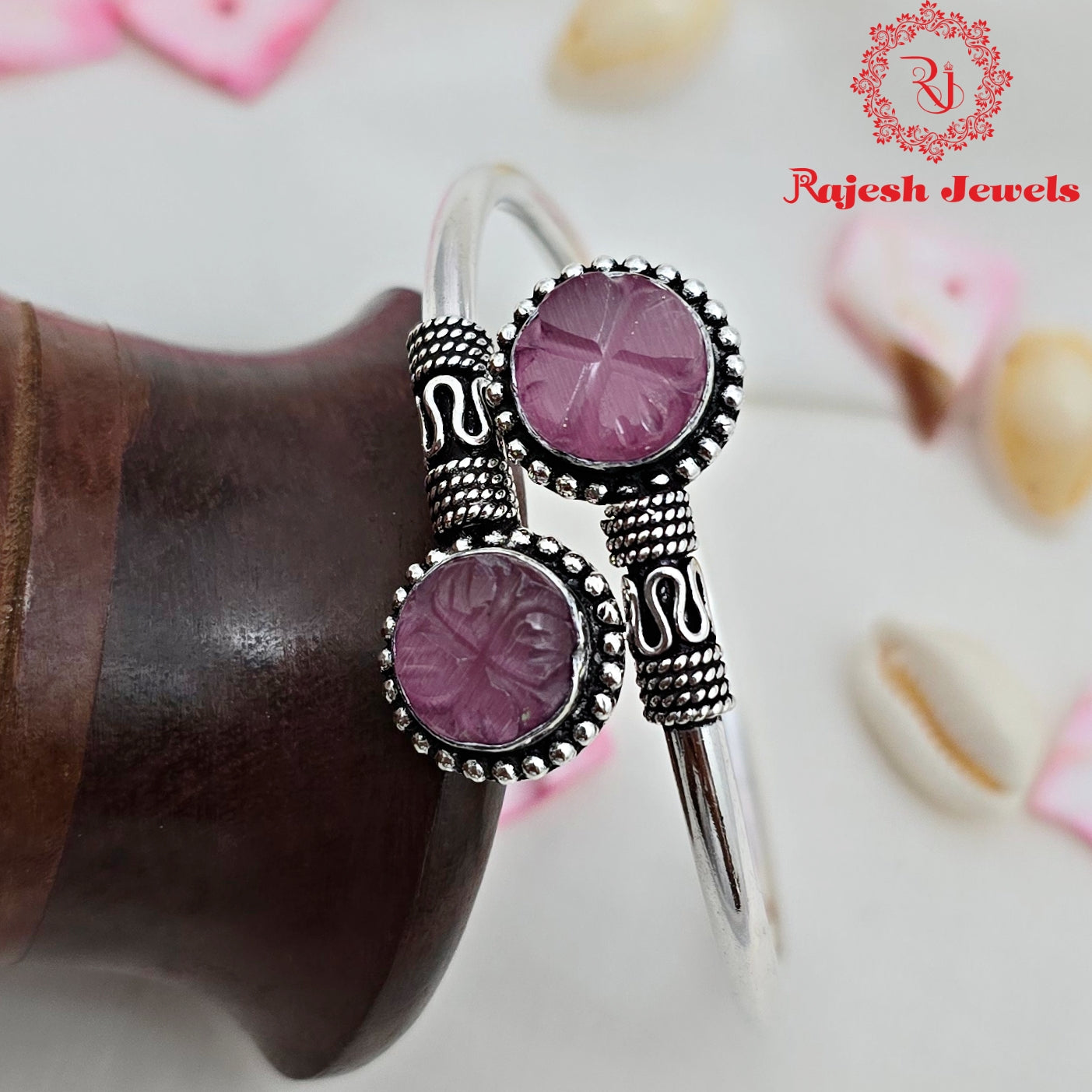 92.5 Pure Silver Oxidised Antique Finish Handmade Hand Kada Studded With Semi Precious Stones