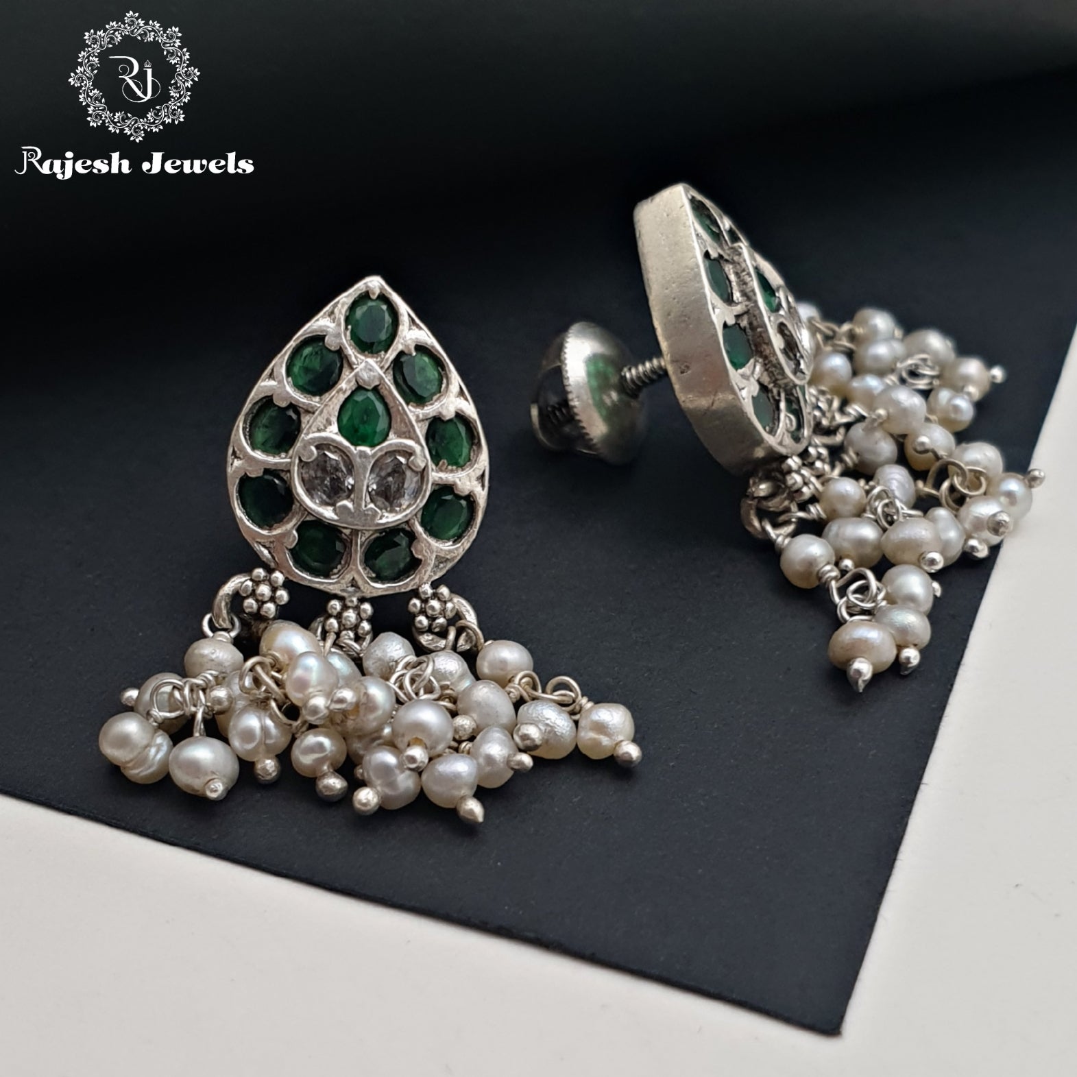92.5 Pure Silver Oxidised Antique Finish Handmade Stud Earrings Studded With Semi Precious Stones