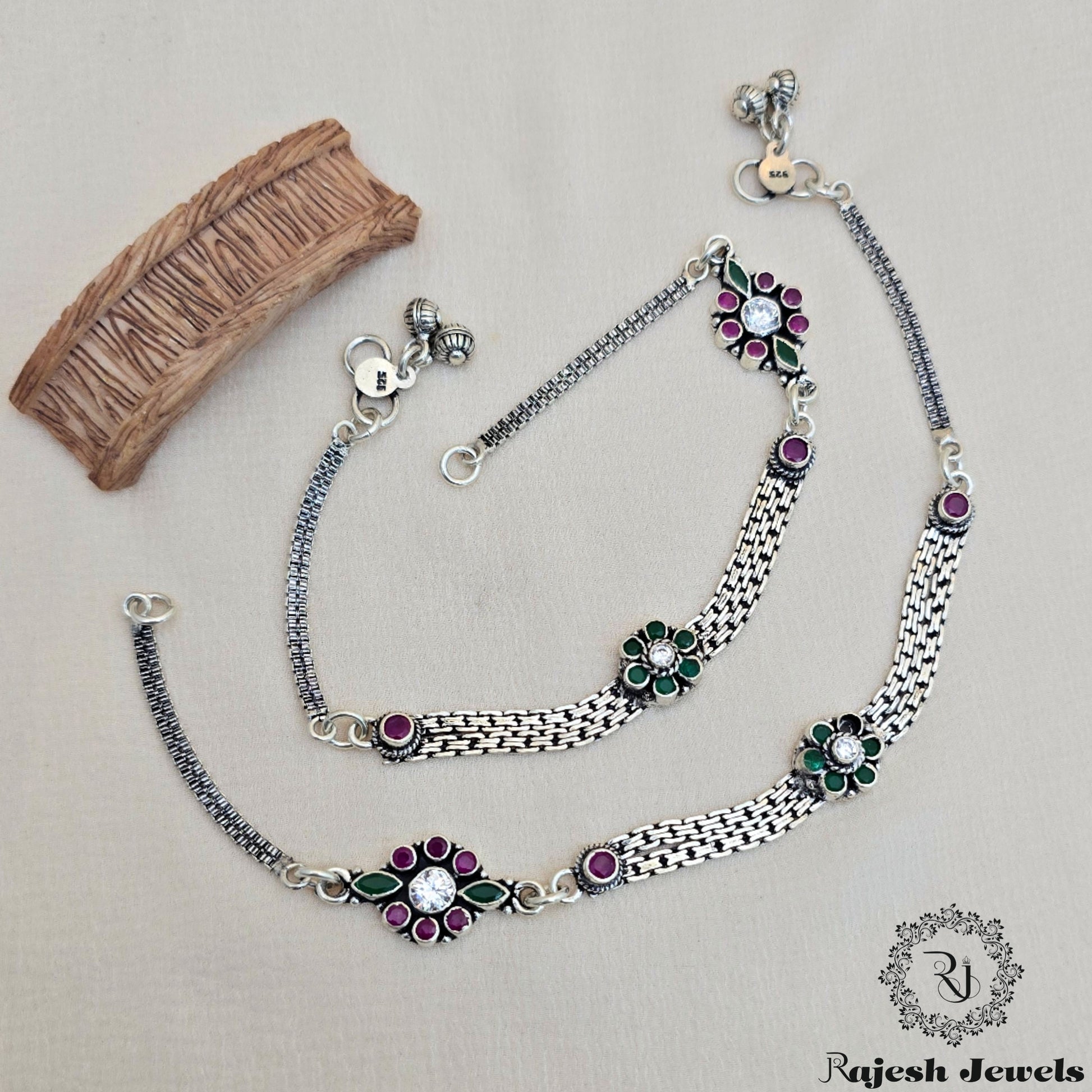 92.5 Pure Silver Oxidised Antique Finish Handmade Anklets Studded With Semi Precious Stones
