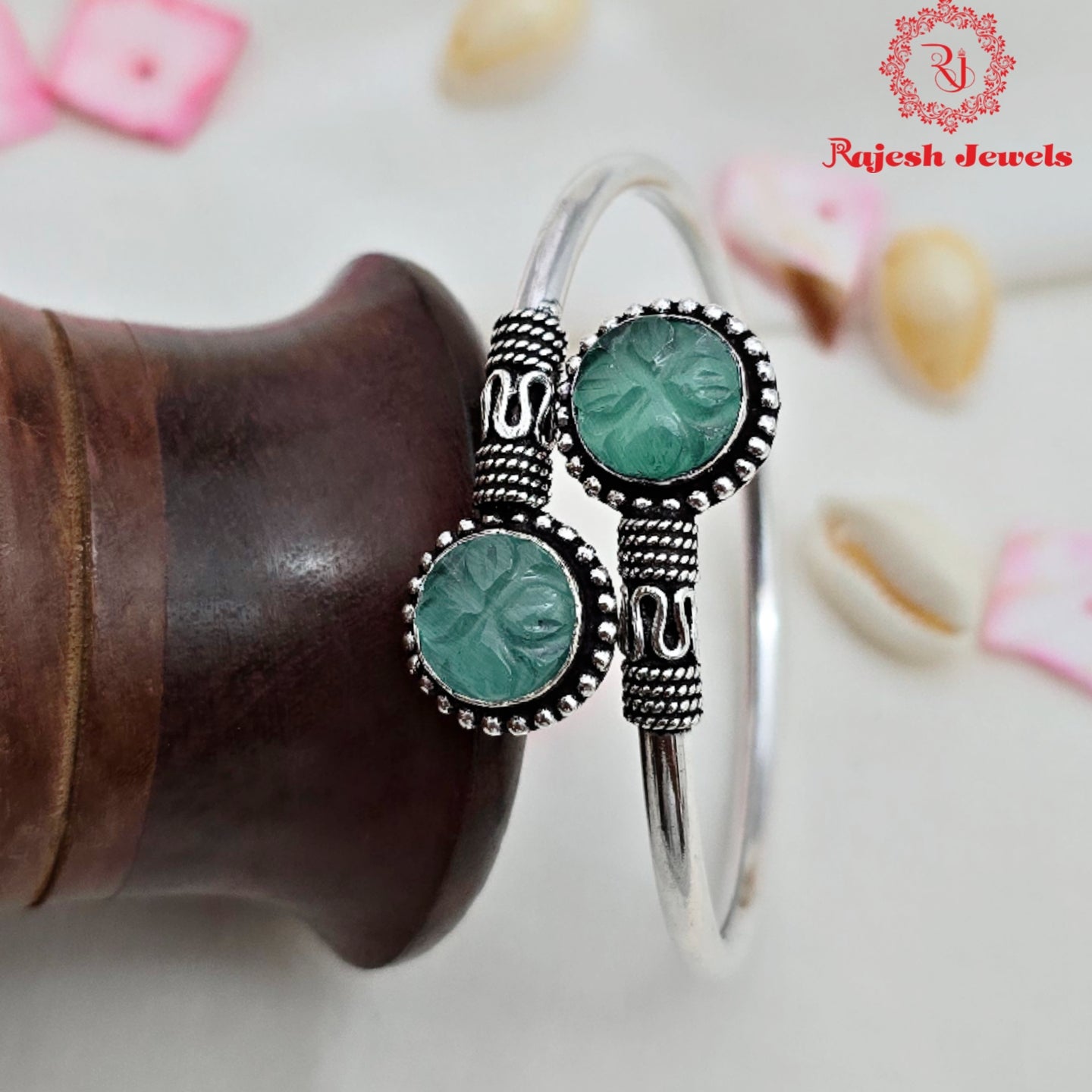 92.5 Pure Silver Oxidised Antique Finish Handmade Hand Kada Studded With Semi Precious Stones
