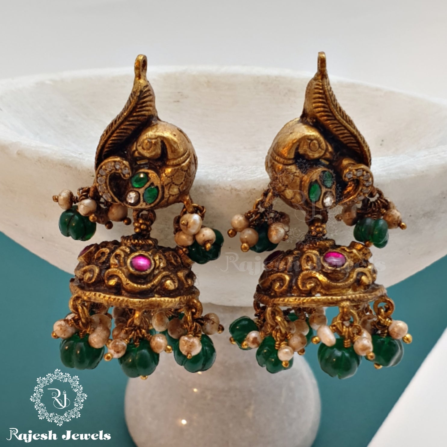 92.5 Pure Silver 22K Antique Gold Plated Nakshi Jumka Studded With Semi Precious Stones