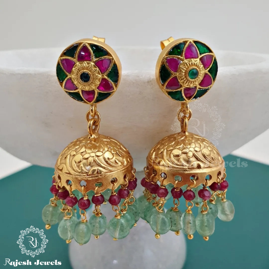 92.5 Pure Silver Temple Jumka Studded With Semi Precious Stones & 22K Gold Polishing