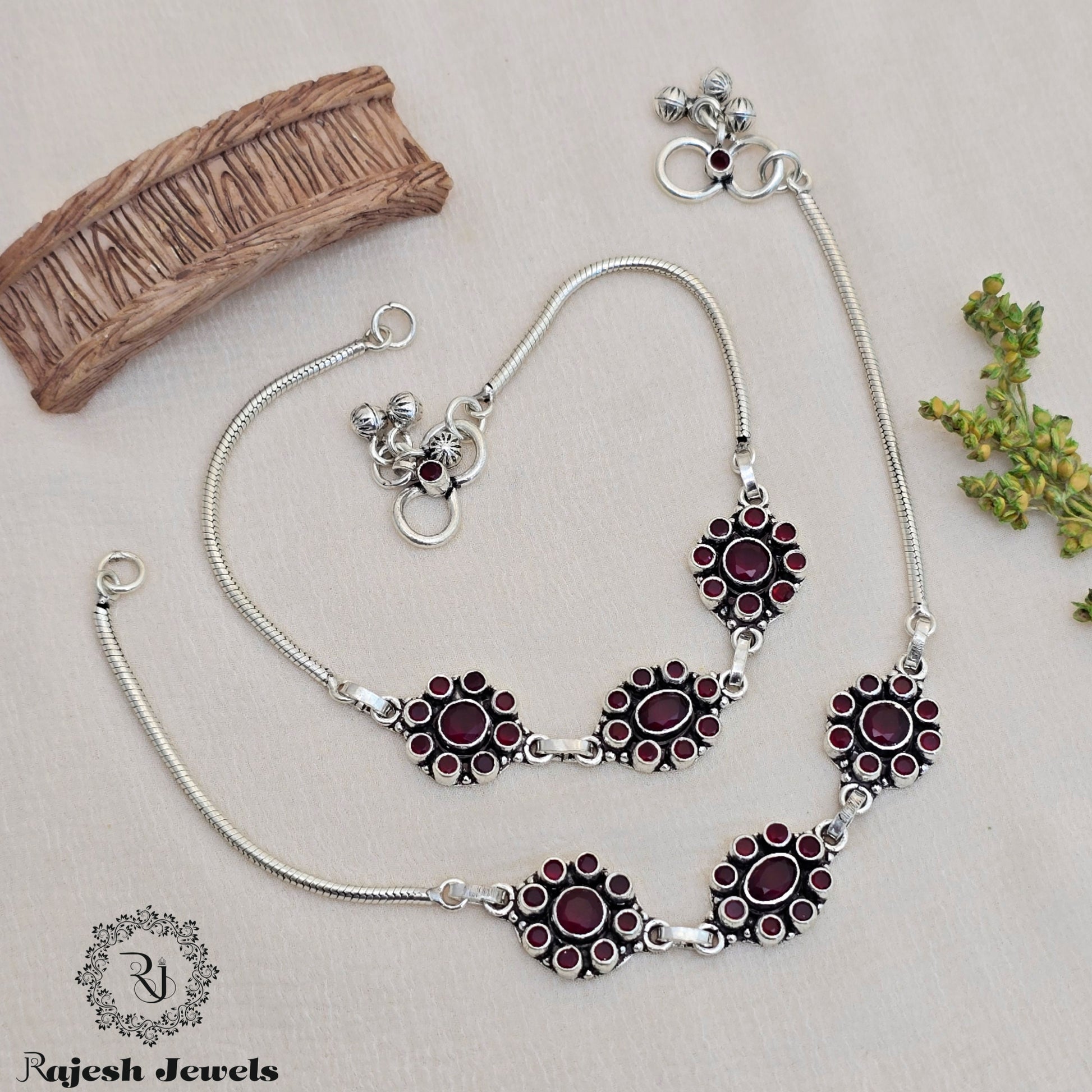 92.5 Pure Silver Oxidised Antique Finish Handmade Anklets Studded With Semi Precious Stones