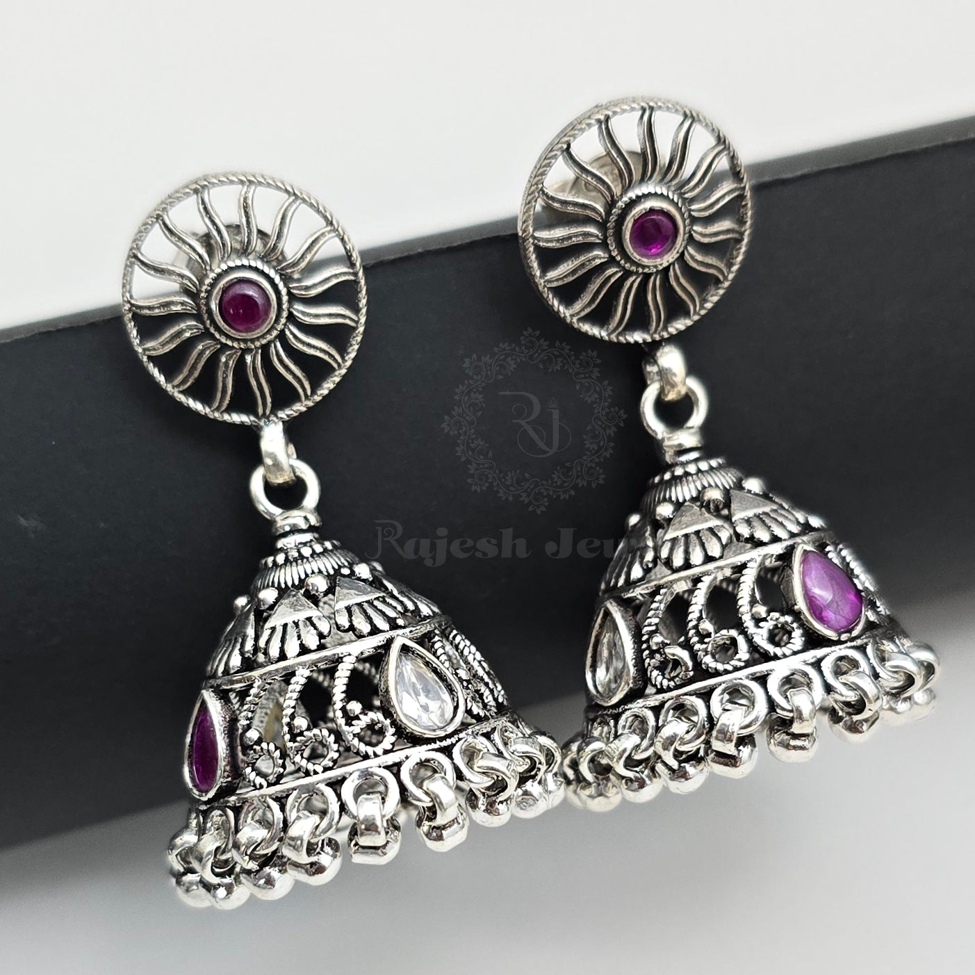 92.5 Pure Silver Oxidised Antique Finish Handmade Jumka Earrings Studded With Semi Precious Stones