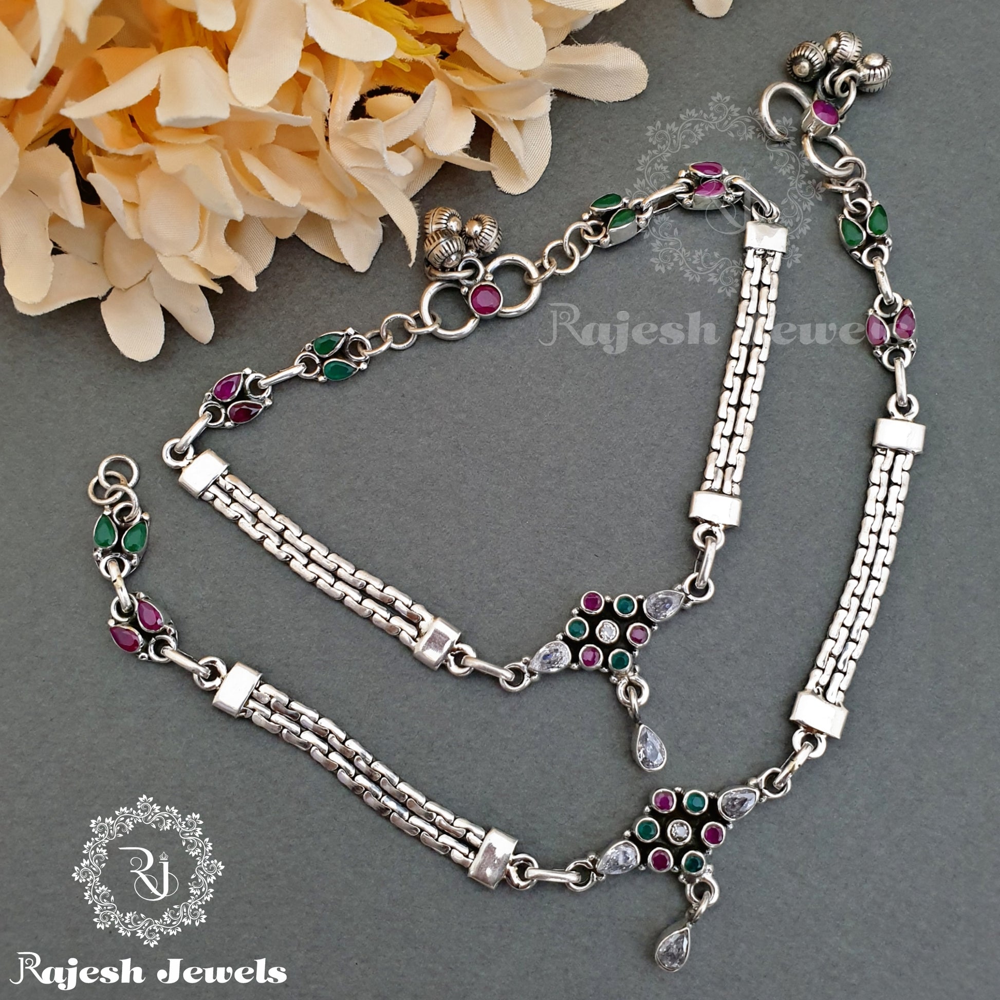 92.5 Pure Silver Oxidised Antique Finish Handmade Anklet Studded With Semi Precious Stones