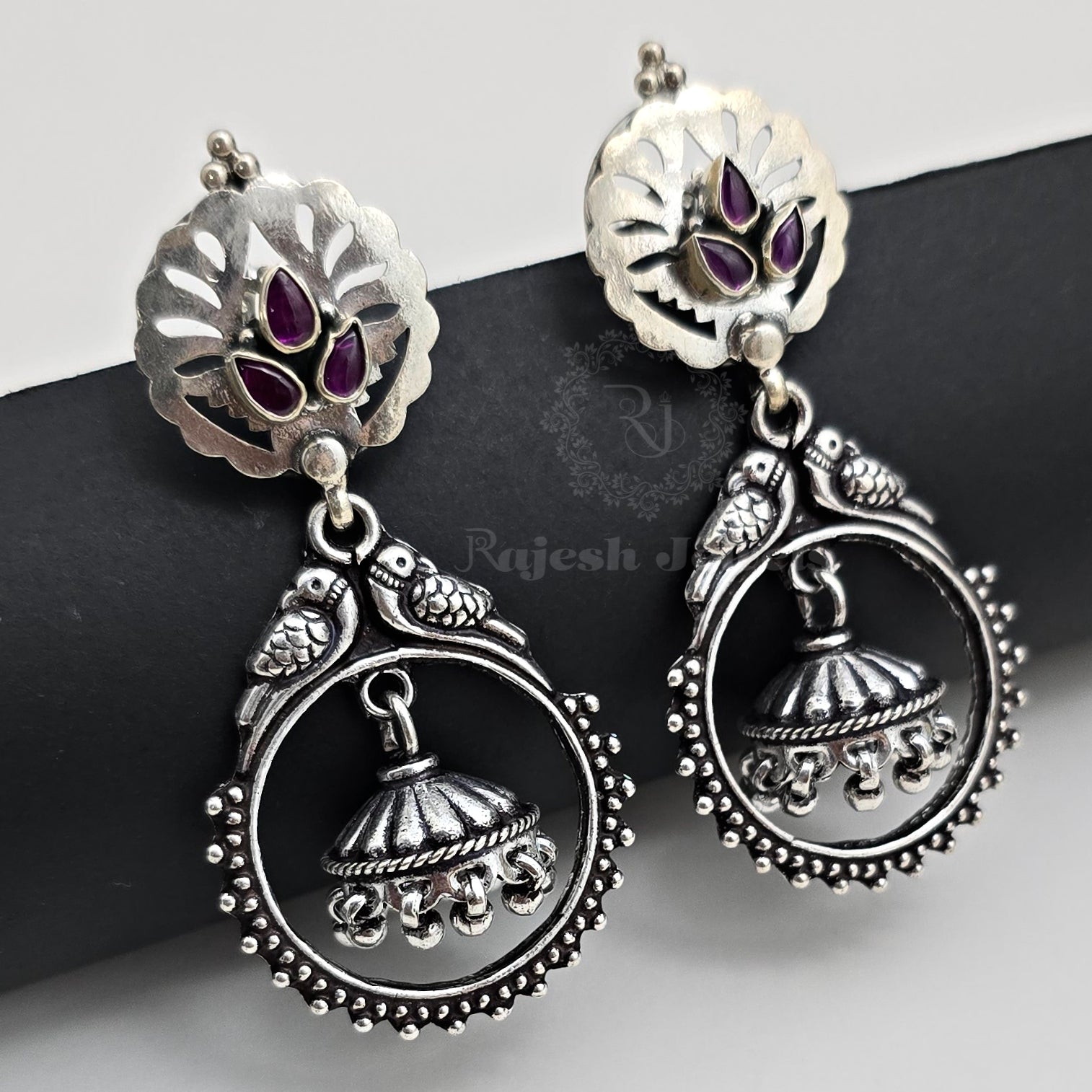 92.5 Pure Silver Oxidised Antique Finish Handmade Chandbali Earrings Studded With Semi Precious Stones