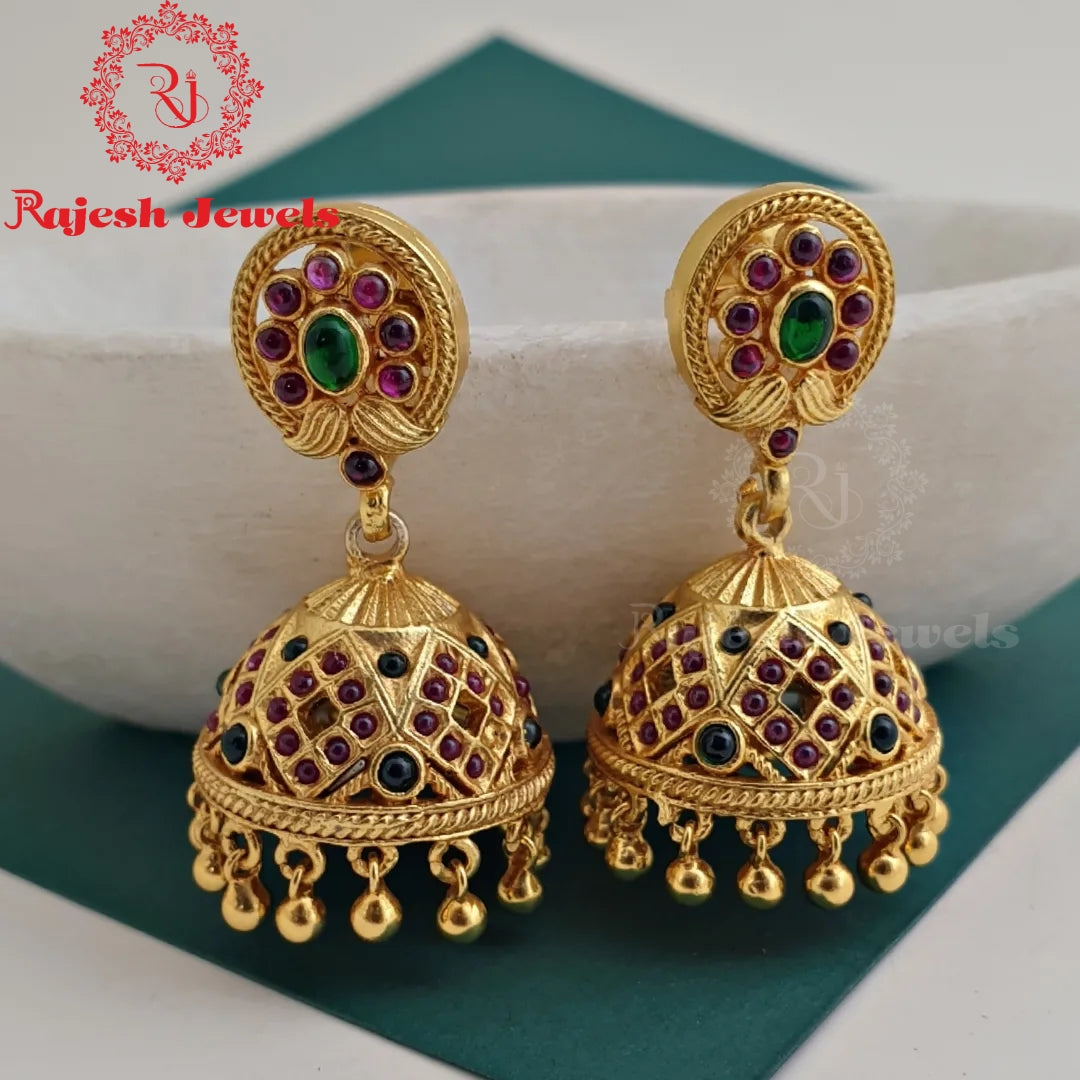 92.5 Pure Silver Temple Jumka Studded With Semi Precious Stones & 22K Gold Polishing