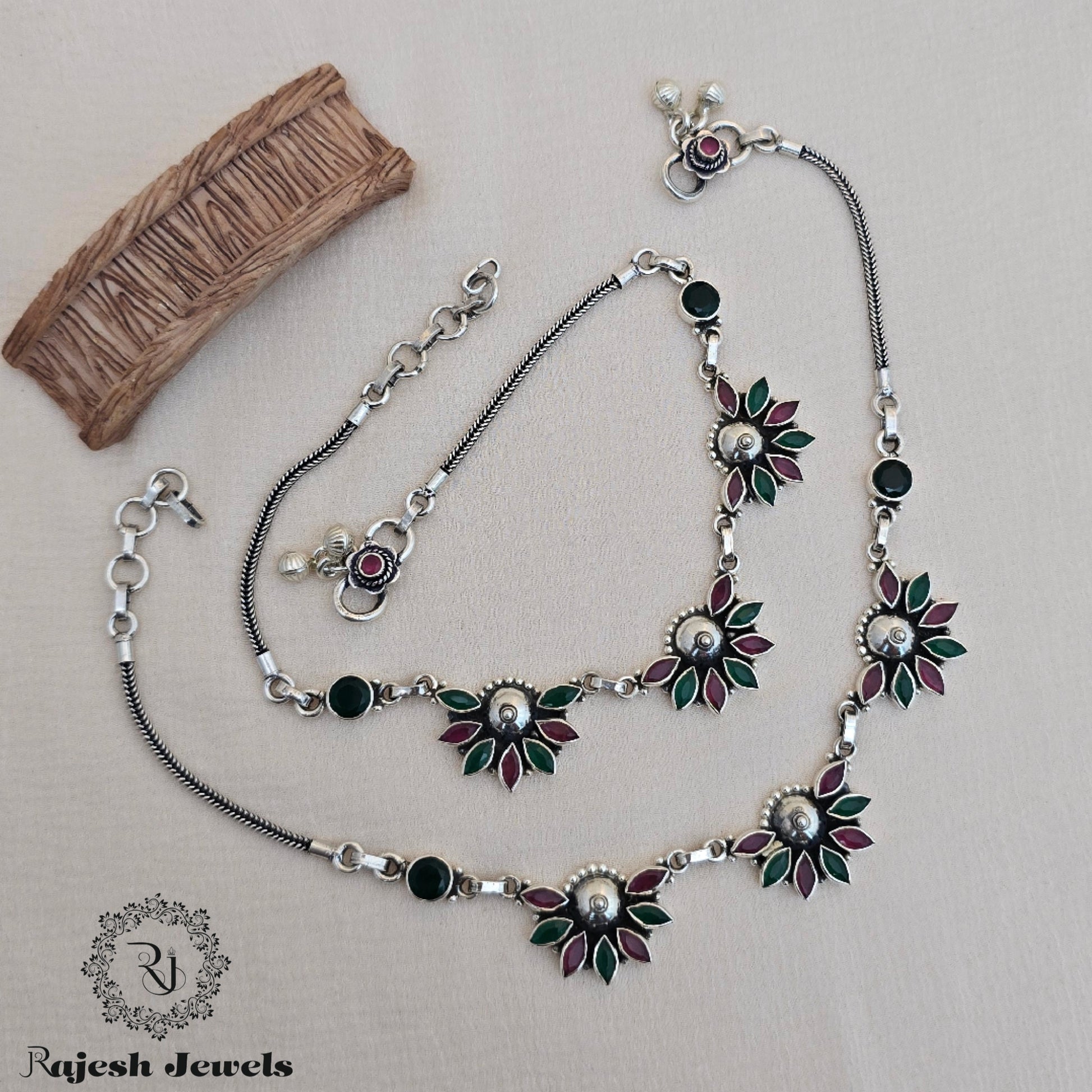 92.5 Pure Silver Oxidised Antique Finish Handmade Anklets Studded With Semi Precious Stones