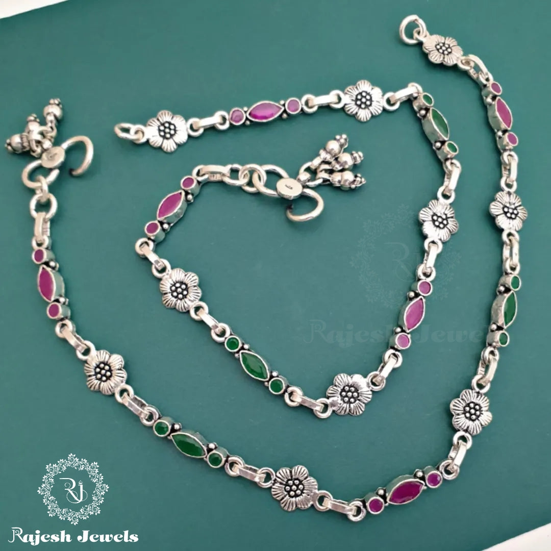 92.5 Pure Silver Oxidised Antique Finish Handmade Anklet Studded With Semi Precious Stones