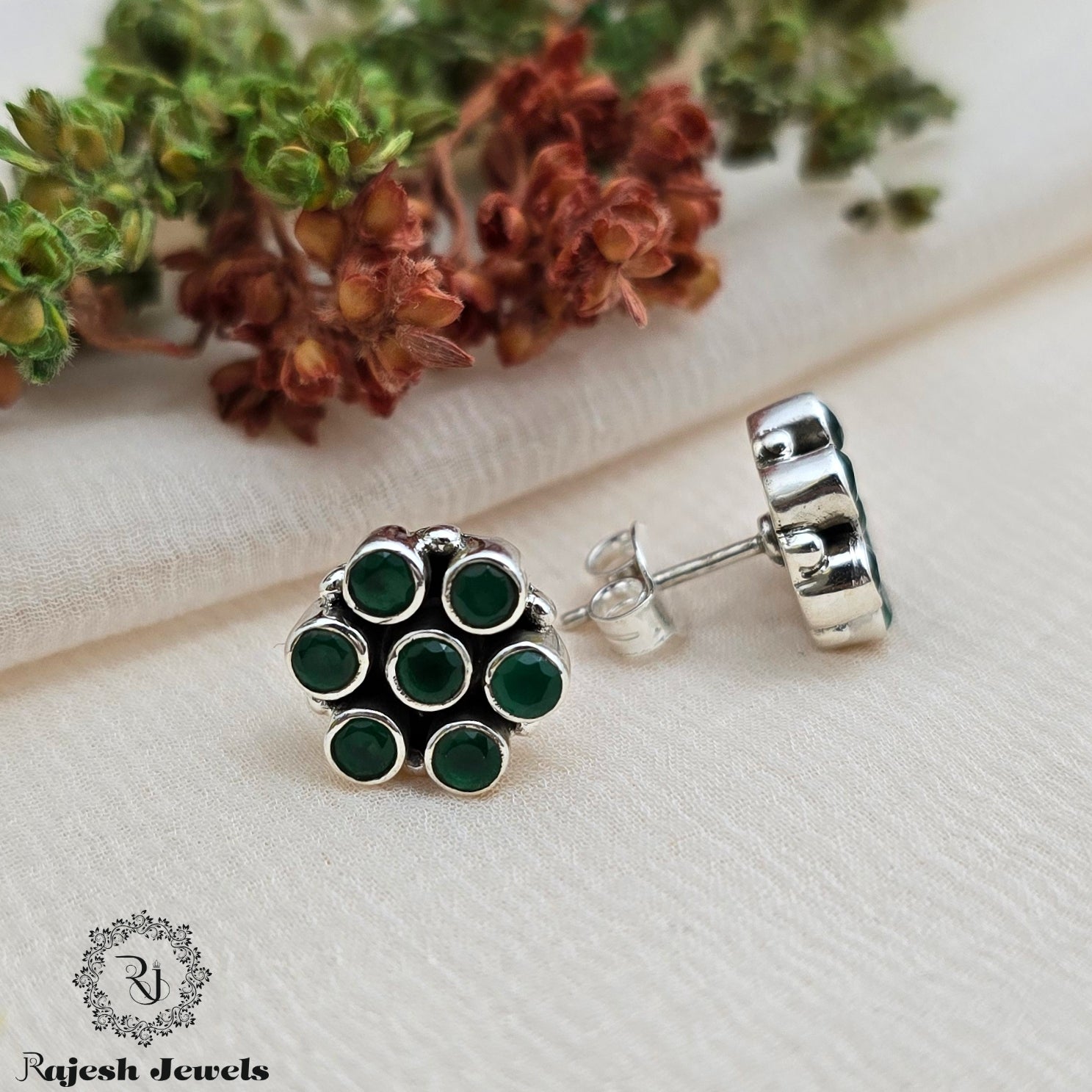 92.5 Pure Silver Oxidised Antique Finish Handmade Stud Earrings Studded With Semi Precious Stones