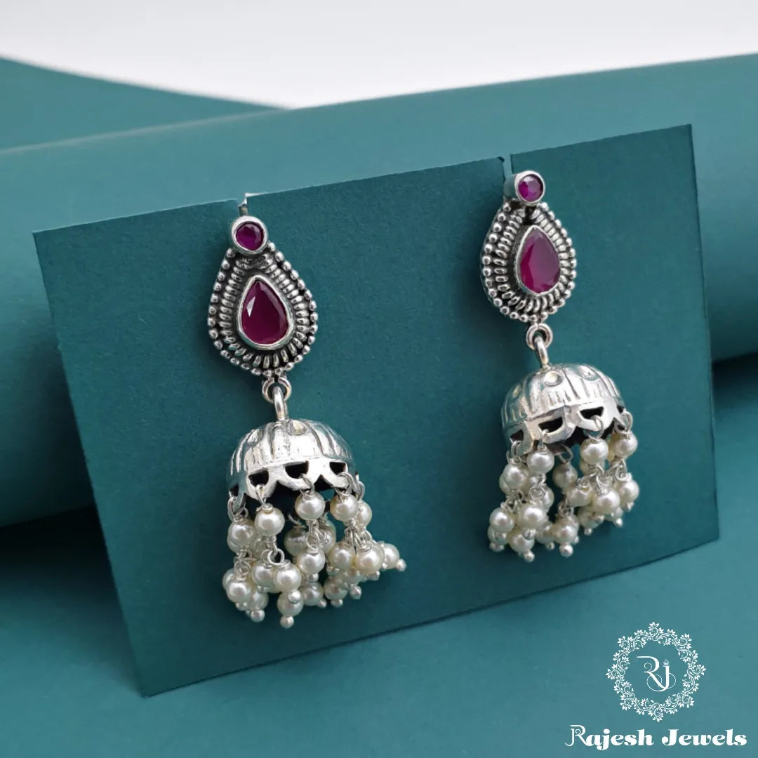 92.5 Pure Silver Oxidised Antique Finish Handmade Jumka Earrings Studded With Semi Precious Stones