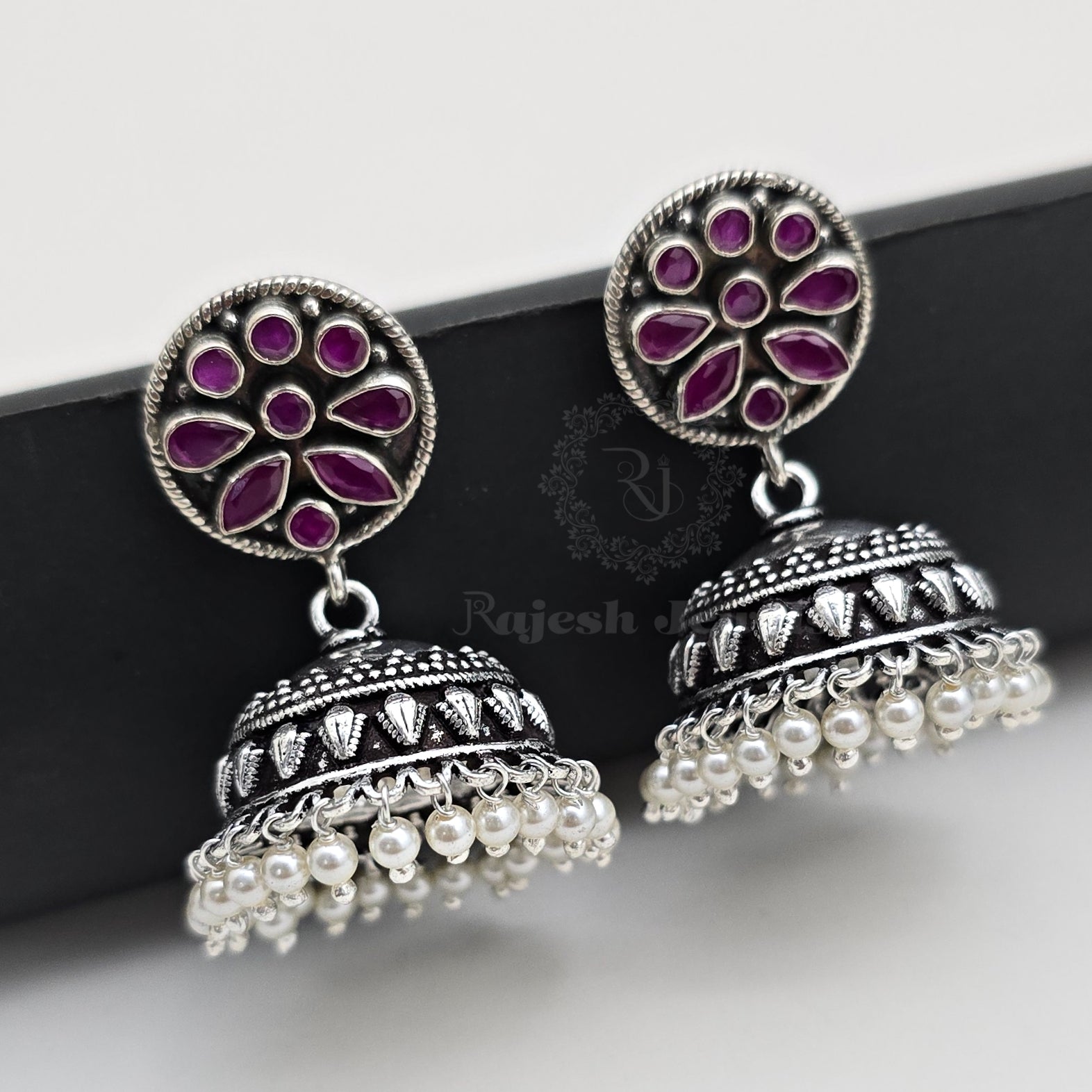 92.5 Pure Silver Oxidised Antique Finish Handmade Jumka Earrings Studded With Semi Precious Stones