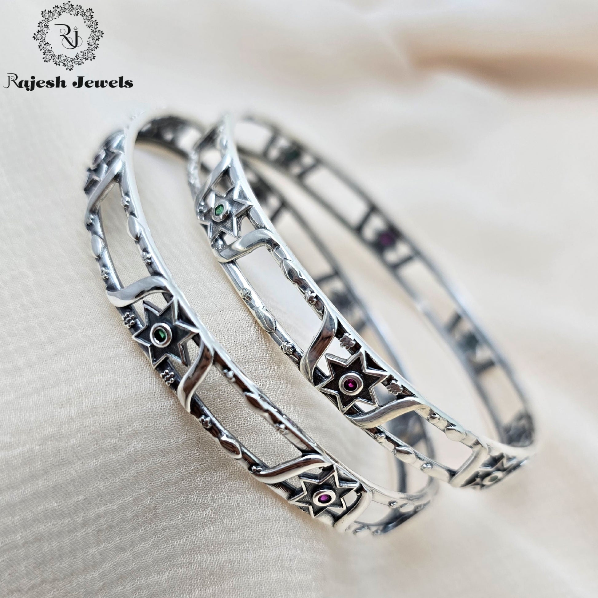 92.5 Pure Silver Oxidised Antique Finish Handmade Filigree Worked Bangles Studded With Semi Precious Stones