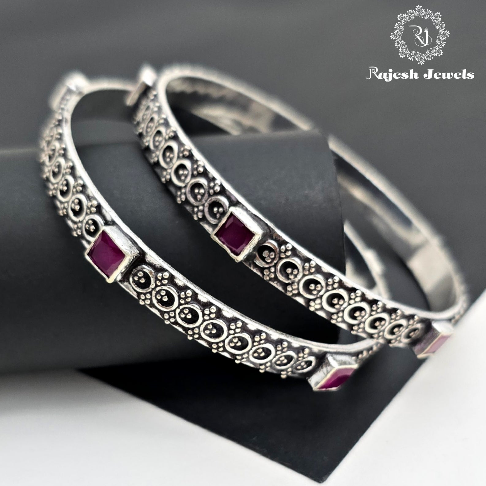 92.5 Pure Silver Oxidised Antique Finish Handmade Bangles Studded With Semi Precious Stones