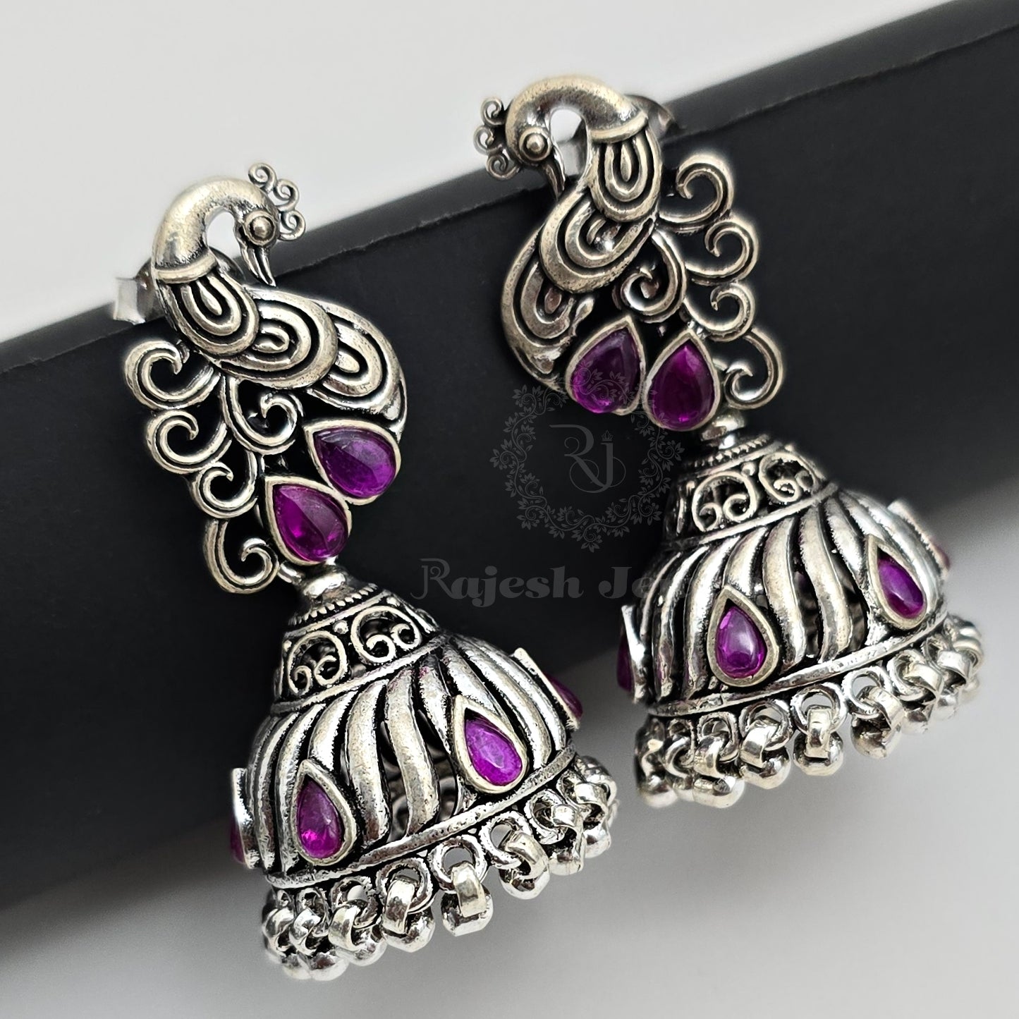 92.5 Pure Silver Oxidised Antique Finish Handmade Jumka Earrings Studded With Semi Precious Stones
