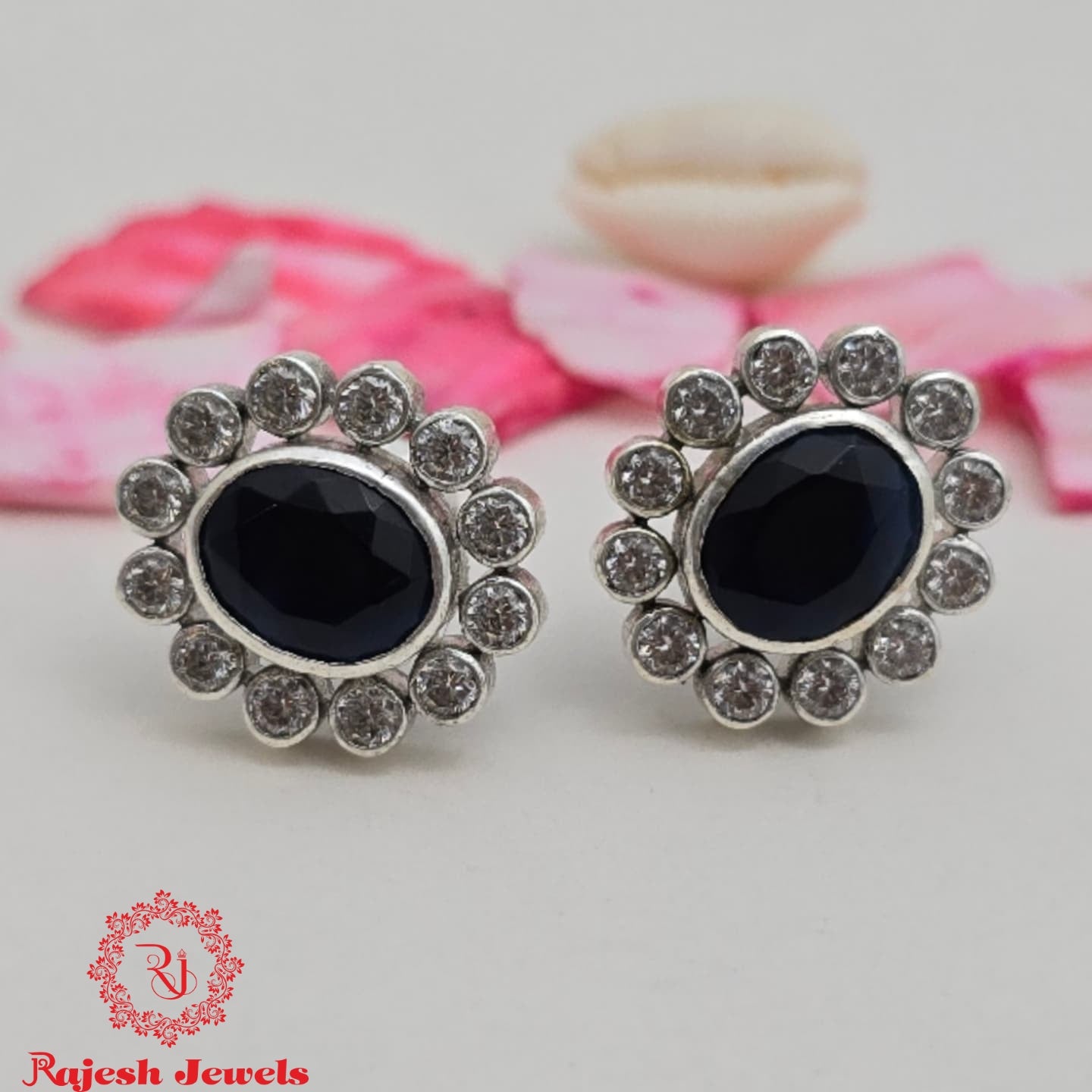 92.5 Pure Silver Oxidised Antique Finish Handmade Stud Earrings Studded With Semi Precious Stones