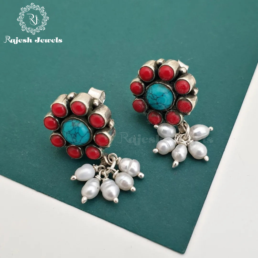 92.5 Pure Silver Oxidised Antique Finish Handmade Earrings Studded With Semi Precious Stones