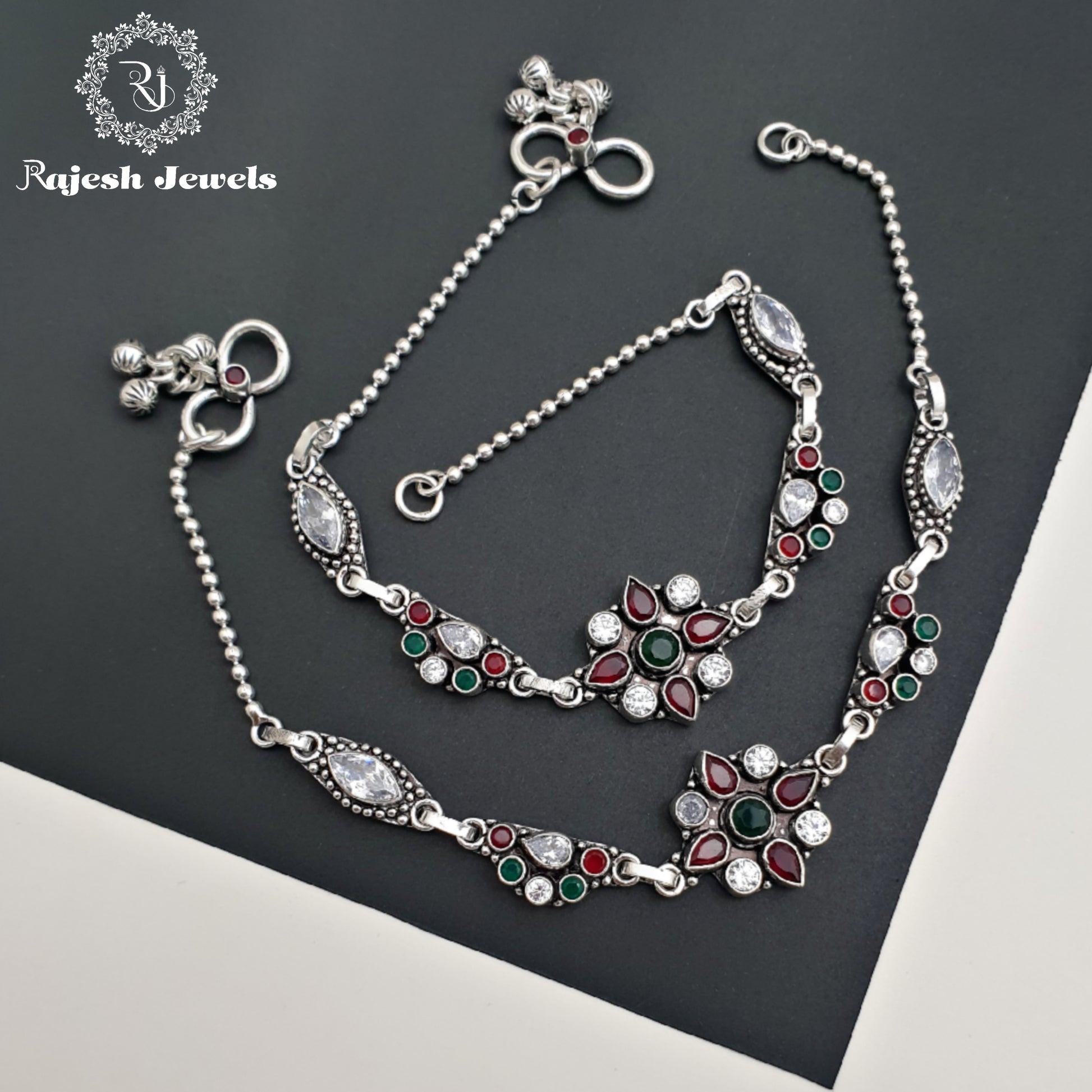 92.5 Pure Silver Oxidised Antique Finish Handmade Anklet Studded With Semi Precious Stones