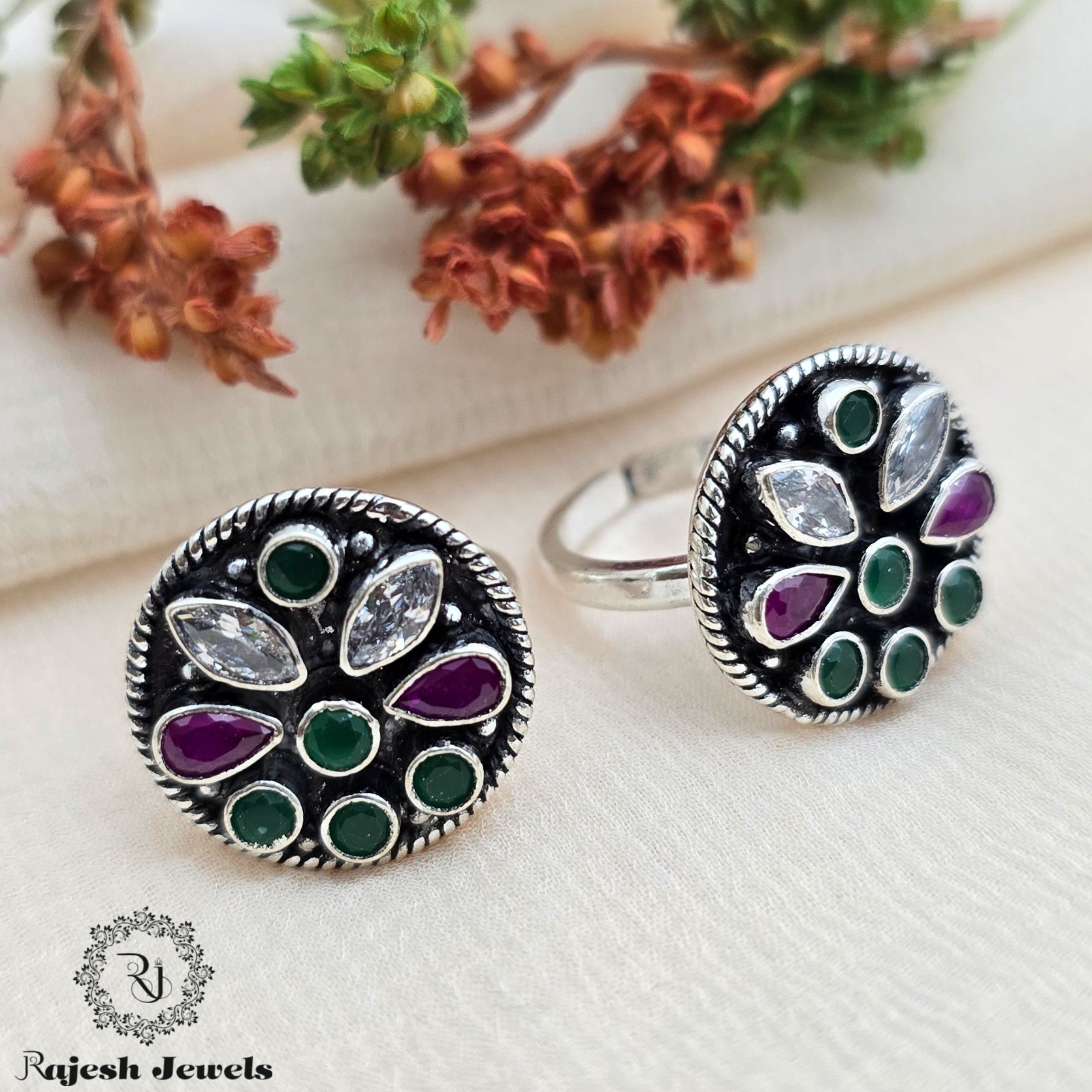 92.5 Pure Silver Oxidised Antique Finish Handmade Toerings Studded With Semi Precious Stones