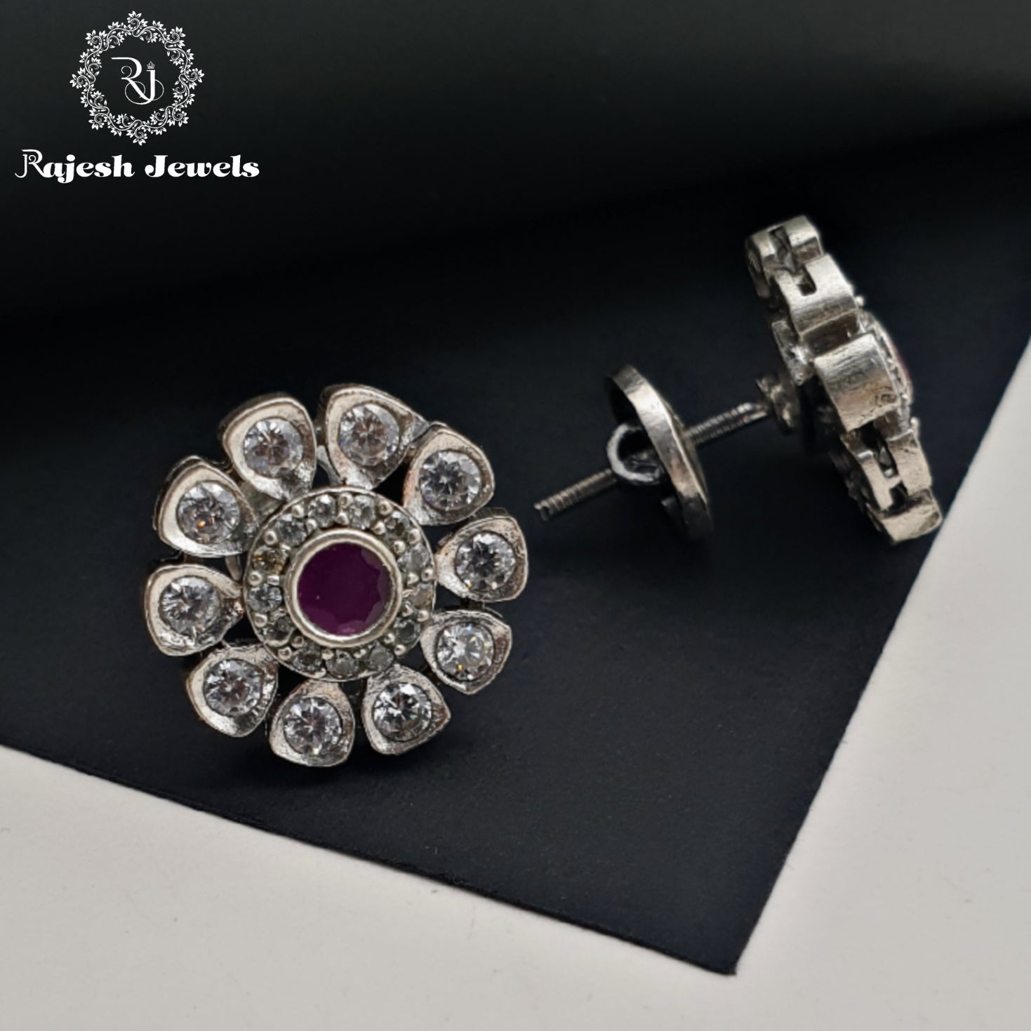92.5 Pure Silver Oxidised Antique Finish Handmade Stud Earrings Studded With Semi Precious Stones
