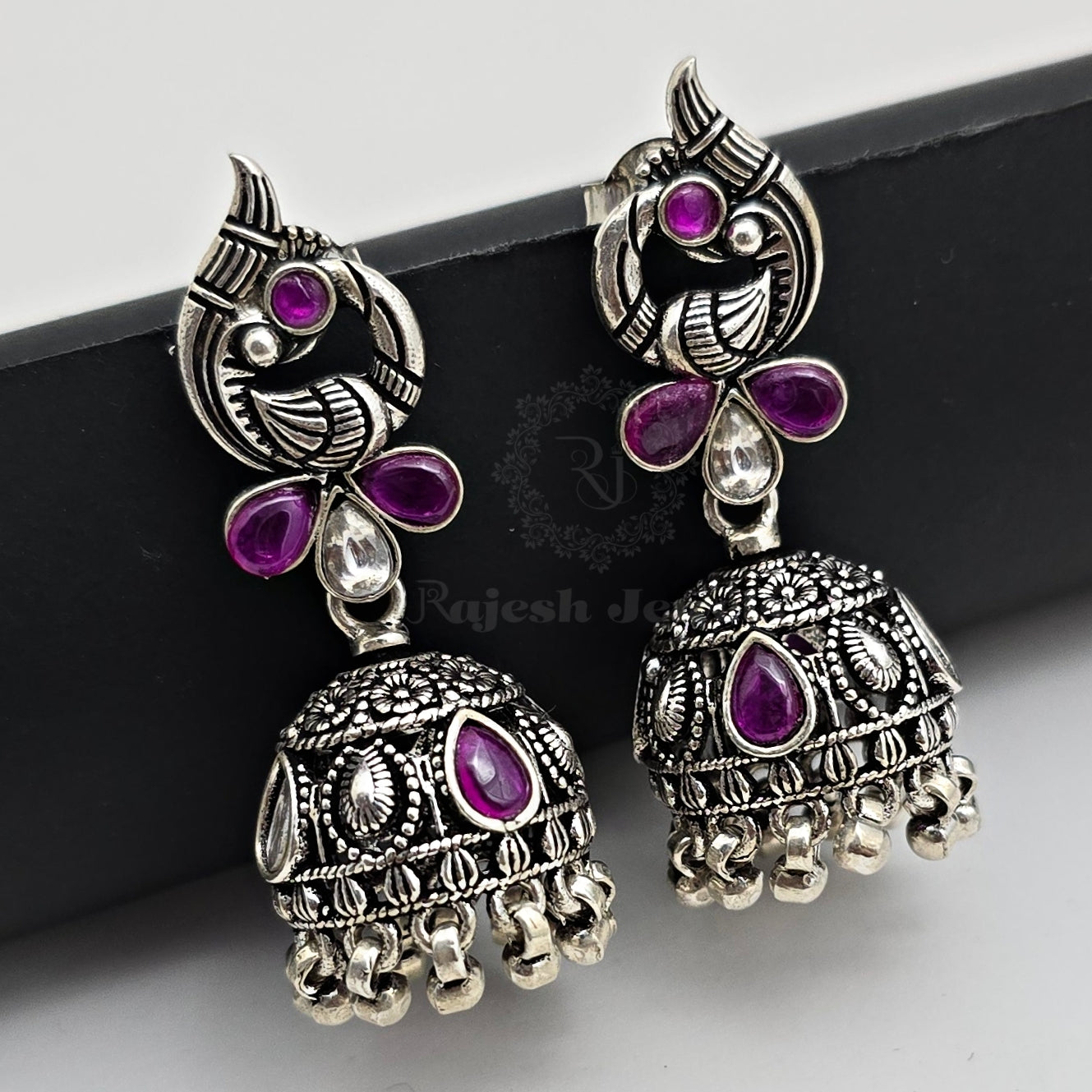 92.5 Pure Silver Oxidised Antique Finish Handmade Jumka Earrings Studded With Semi Precious Stones