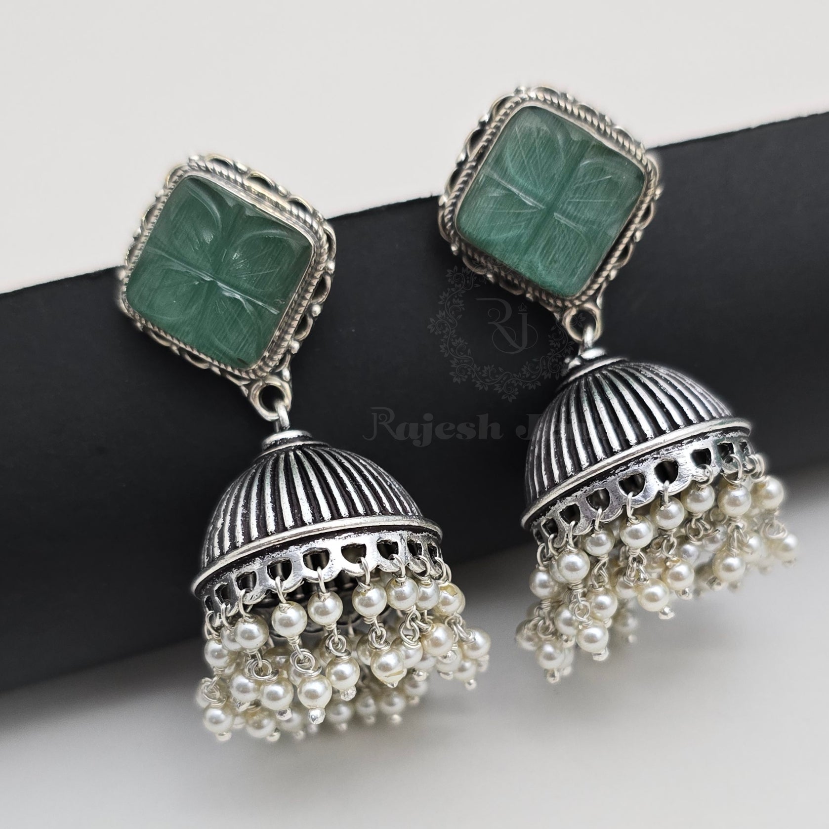 92.5 Pure Silver Oxidised Antique Finish Handmade Jumka Earrings Studded With Semi Precious Stones