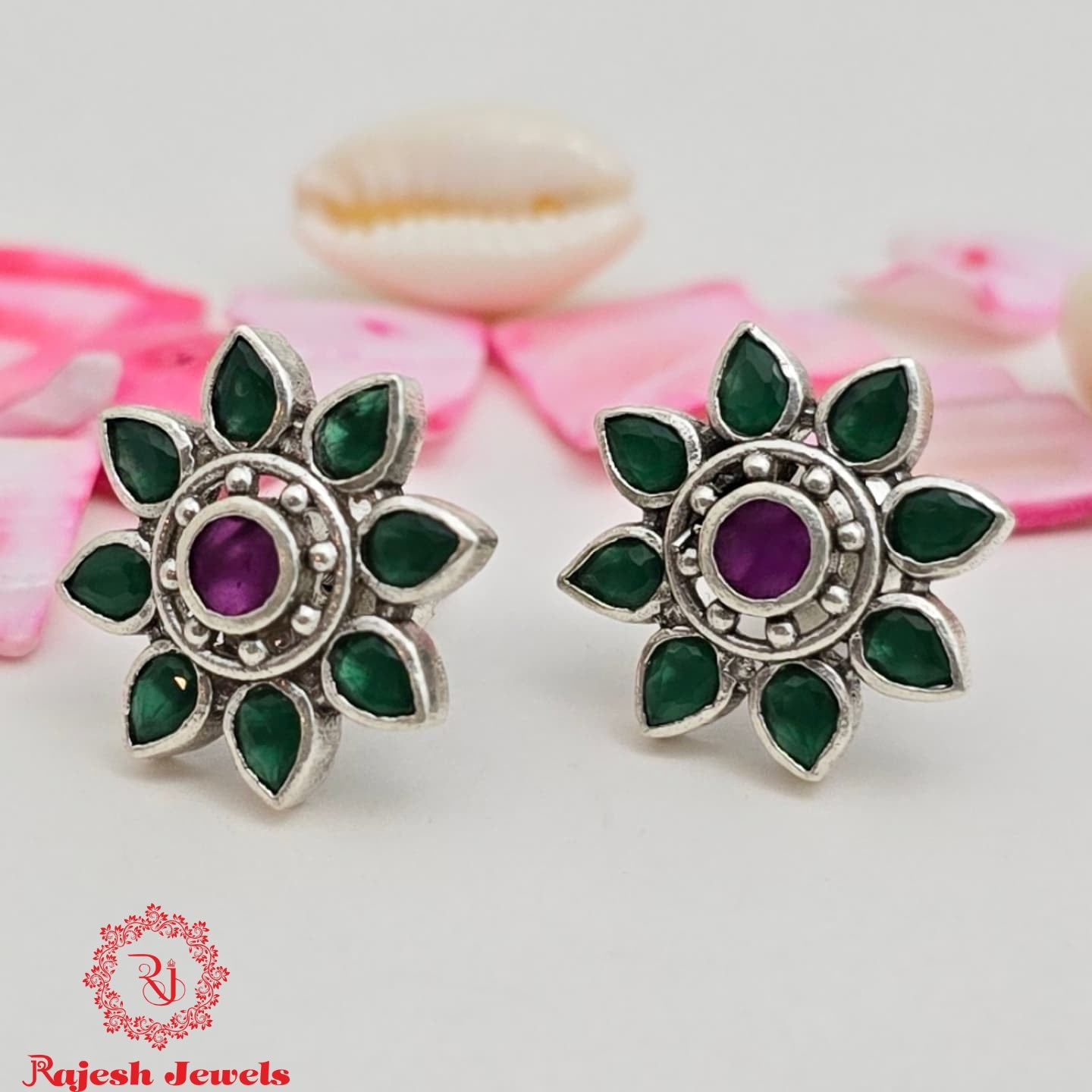 92.5 Pure Silver Oxidised Antique Finish Handmade Stud Earrings Studded With Semi Precious Stones