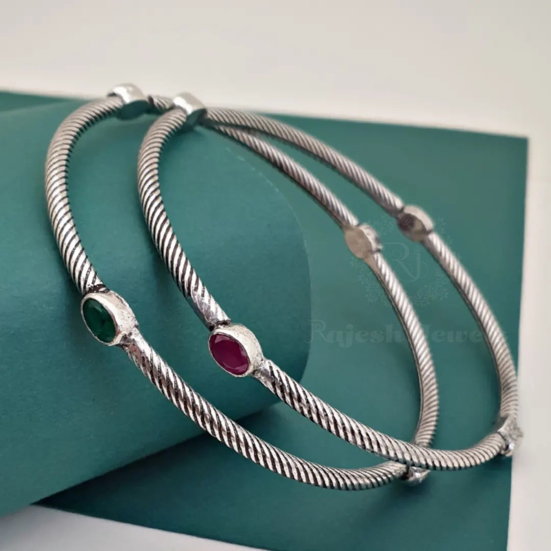 92.5 Pure Silver Oxidised Antique Finish Handmade Bangles Studded With Semi Precious Stones